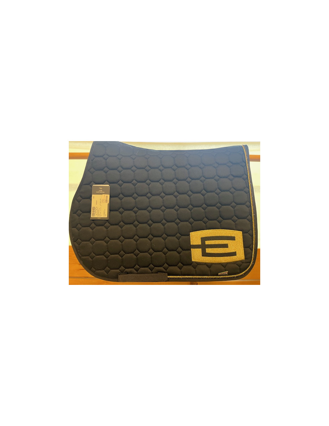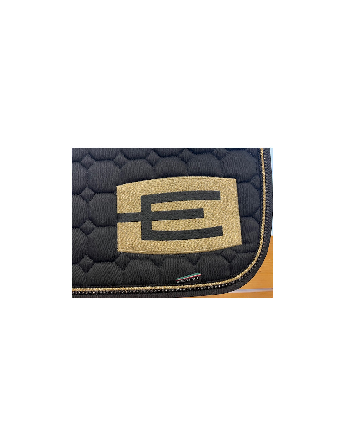 Svart hoppschabrak med den populära E-loggan E56 (glitter gold-black) på vänster sida och med passpoal P112 (black glitter, 3 mm) och svart bling ( S066).