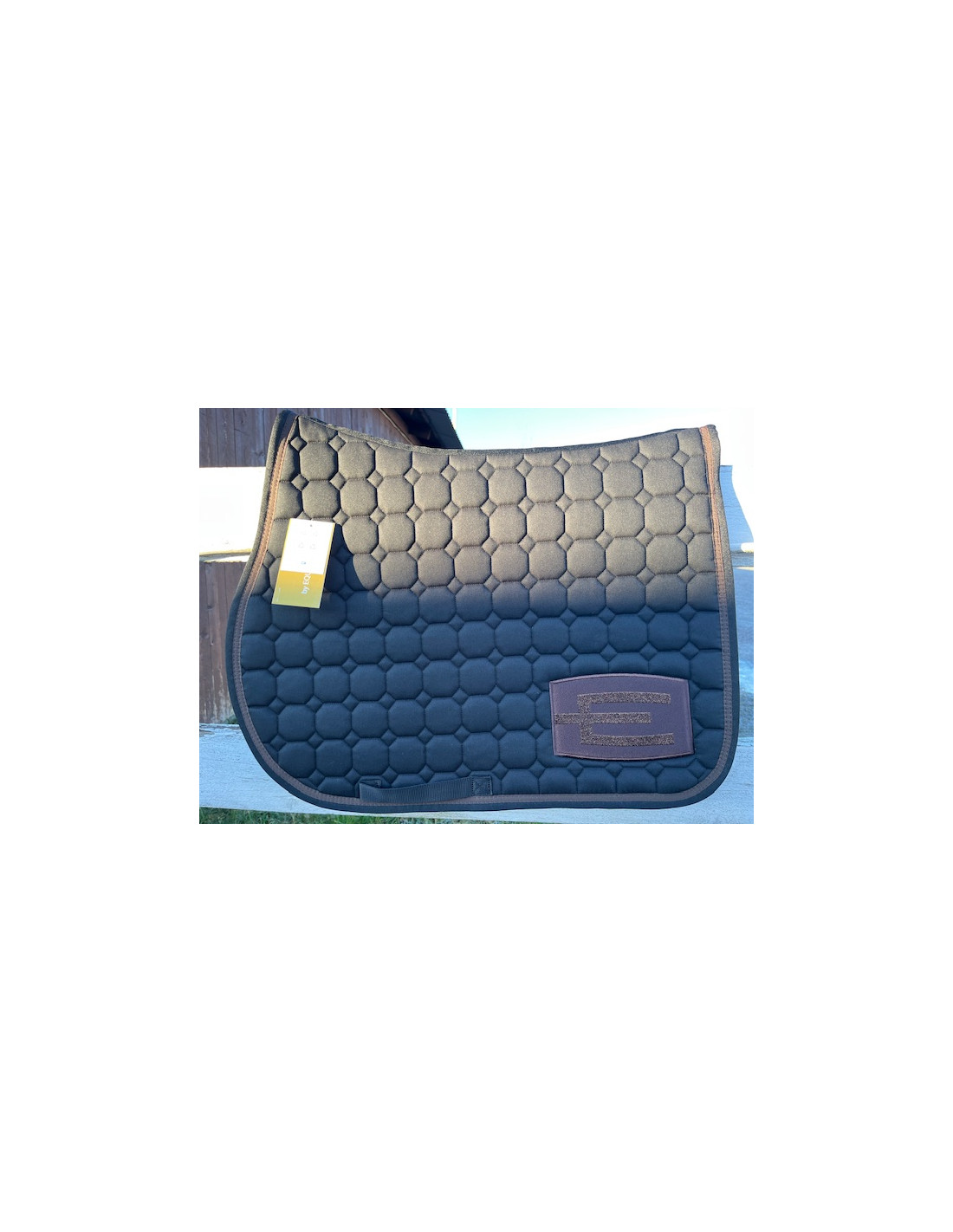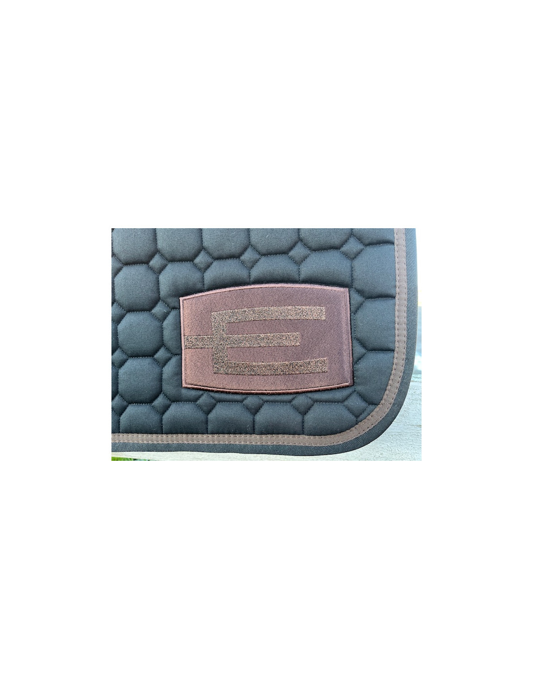 Svart hoppschabrak med den populära E-loggan E60 (Brown-glitter bornze) på vänster sida, samt med band FT169 (brown)