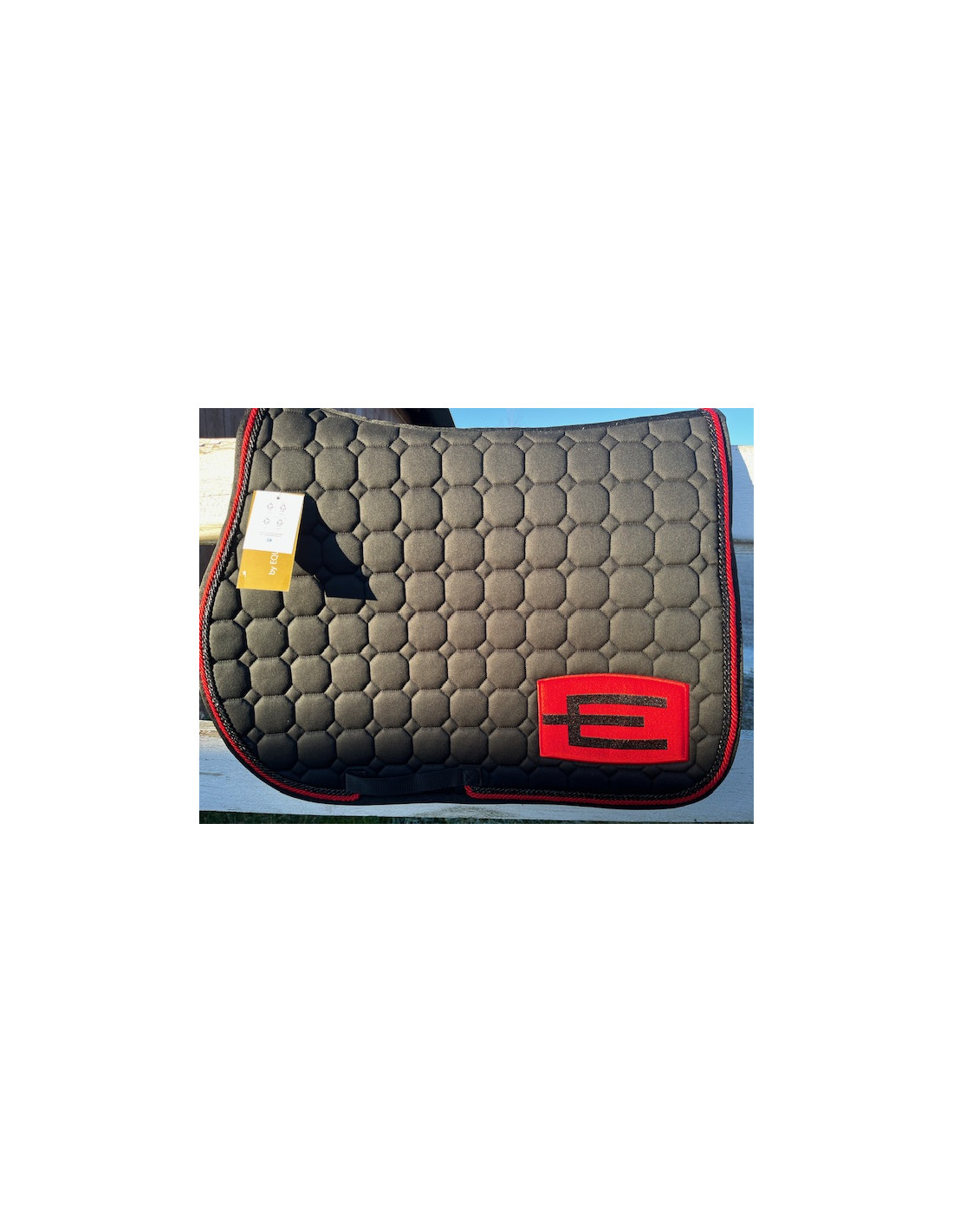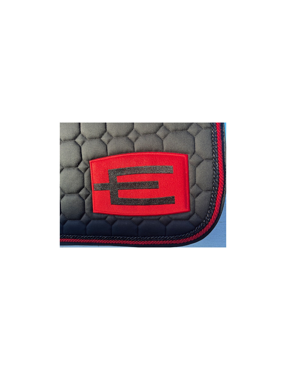 Svart hoppschabrak med den populära E-loggan E44 (Red-glitter black) på vänster sida, samt med passpoal P112 (glitter black, 6 mm) och passpoal P52 (Röd, 6 mm).