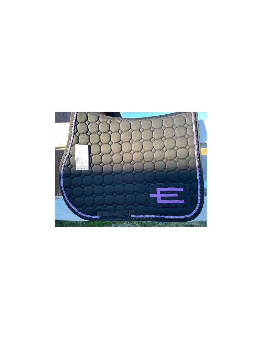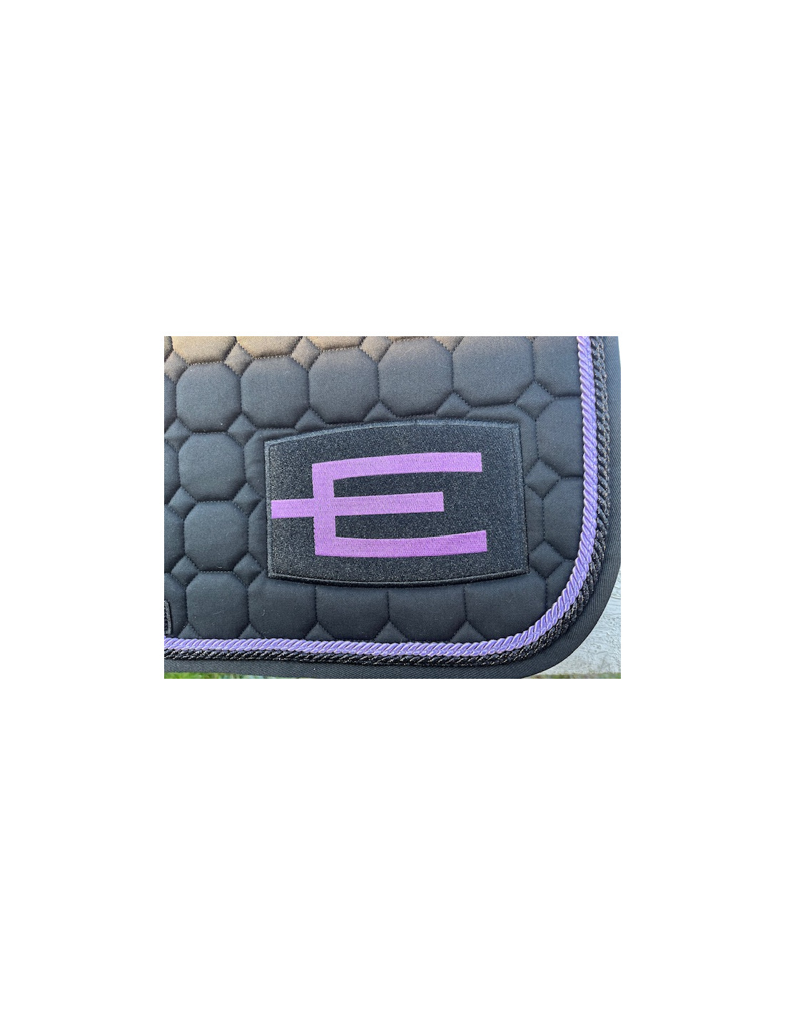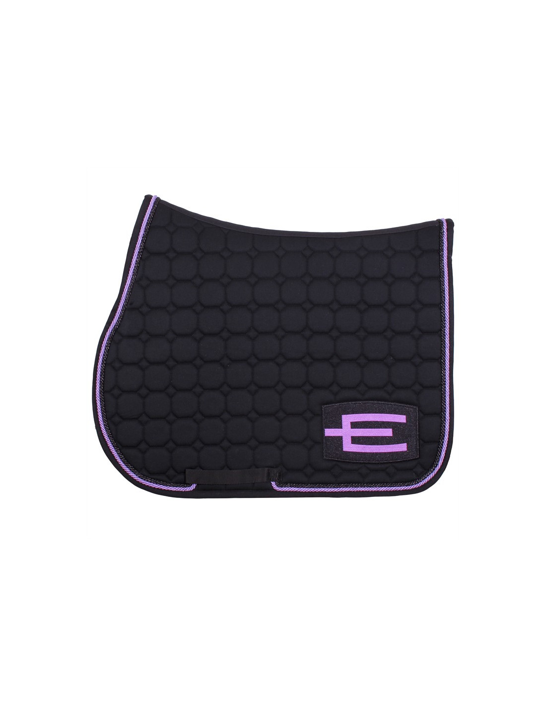 Svart hoppschabrak med den populära E-loggan E52 (glitter black-purple) på vänster sida och med passpoal P71 (purple, 6 mm) innerst och passpoal P112 (black glitter, 6 mm) ytterst.