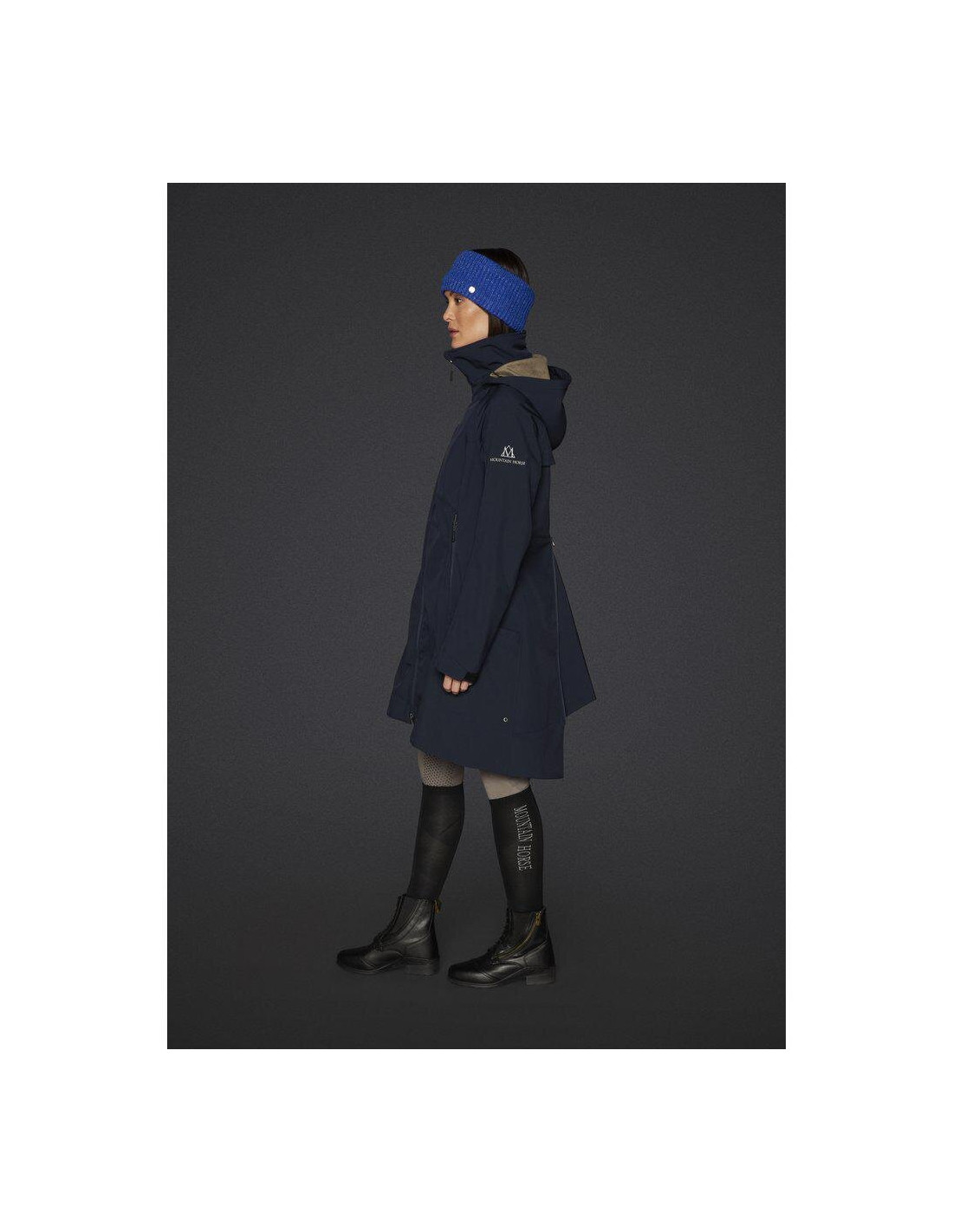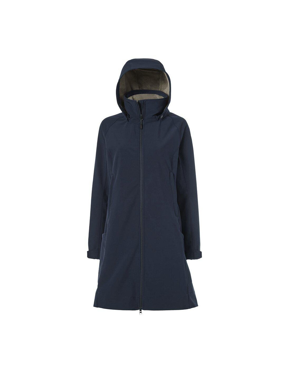 Vatten- och vindtätt tyg med fuskpäls inuti. Fickor framtill och på sidorna, ridsprund bak, ventilationsok och hög krage med avtagbar huva.