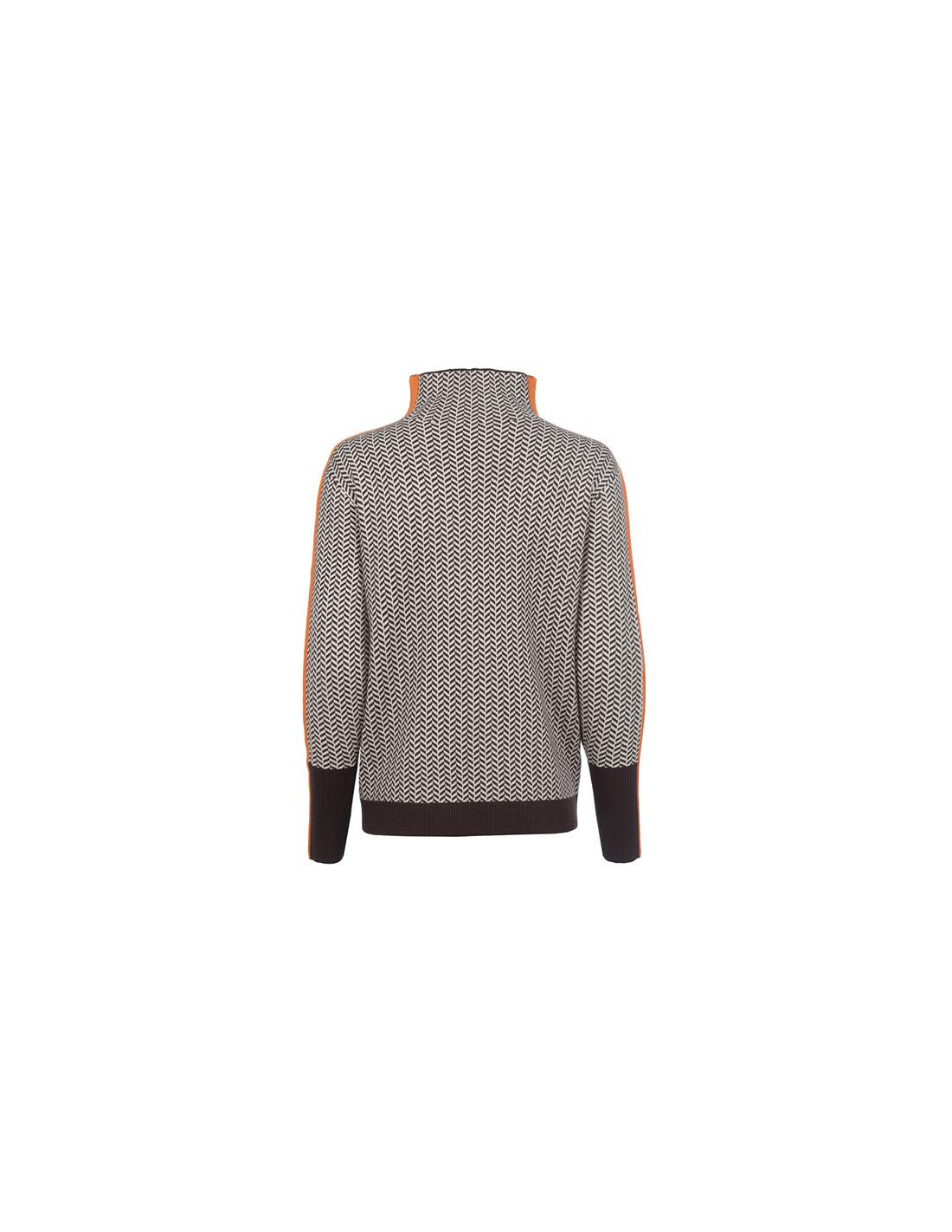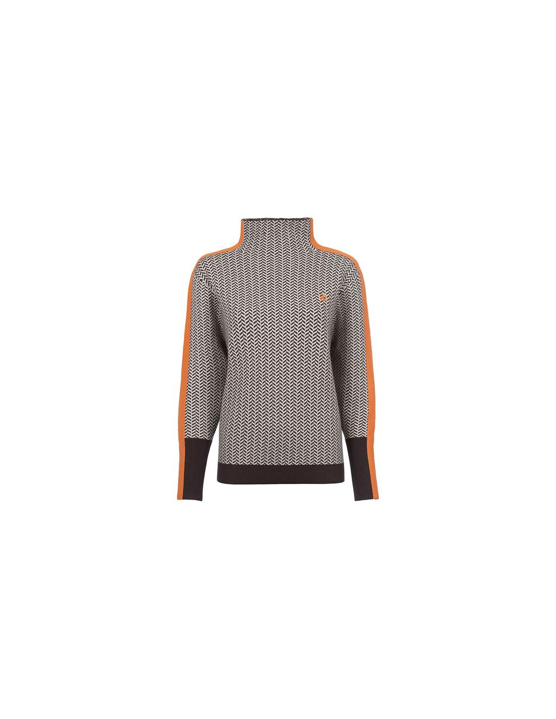 En unik damtröja från Cavallos Premium vinterkollektion med ett snyggt fiskbensmönster över hela kroppen och en elegant ståkrage. Denna bekväma tröja har mjuka ribbstickade muddar och fåll, samt slående orangea ränder från kragen till ärmslutet.